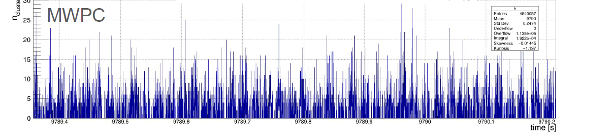 and this is the time distribution of the beam signal on our scintillators. Both detectors show the presence of such a structure. Potential effects in view of the experiment will be studied.